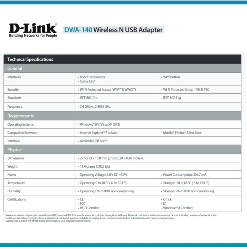 Adaptateur D-Link DWA‑140 USB Sans fil fiche technique: