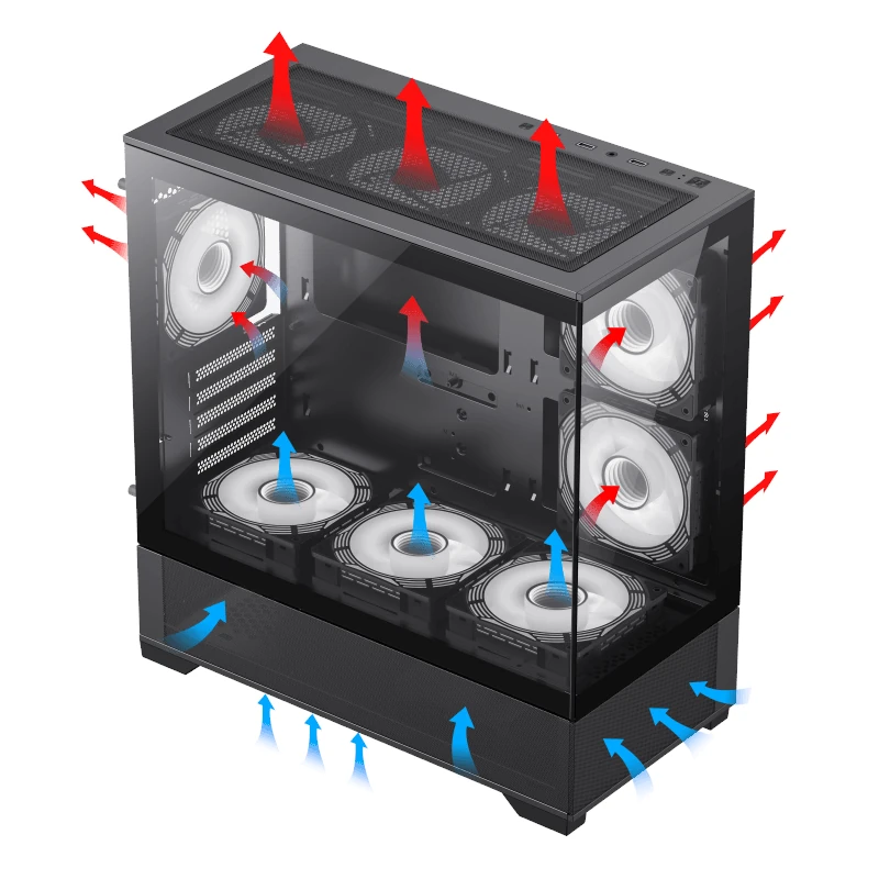 Vista MicroATX tower PC ATX case – Aesthetic looks, airflow focus, easy installation, and ample room for large GPU and cable management. Good build quality computer case made of heavy-duty steel metal frame and 4.0mm tempered glass. ⚡Computer Case Focus on Cooling- The modular motherboard I/O allows you to move the motherboard to a higher/lower position for air-cooled/water-cooled systems. To ensure adequate airflow, a Total 9x120mm fan position, Fine mesh panel at the top, and on the PSU shroud side, help with great ventilation. ⚡Easy Build Gaming PC Case- This case has a lot of flexibilities convenient for components installations: Removeable 5x Sides, Glass to Glass full view; Spacious PC case with Easy Cable Management, A seal plate on the top radiator bracket ensures no pressure leak when installing smaller than a 360 radiator/3x120mm fans at the top. ⚡Latest Gen. Large Graphics Card Ready- This Mid-tower Case is compatible with the largest NVIDIA 4000 series cards thanks to its ample room for graphics cards up to 410mm in length, and 165mm in height (for air cooling mode)