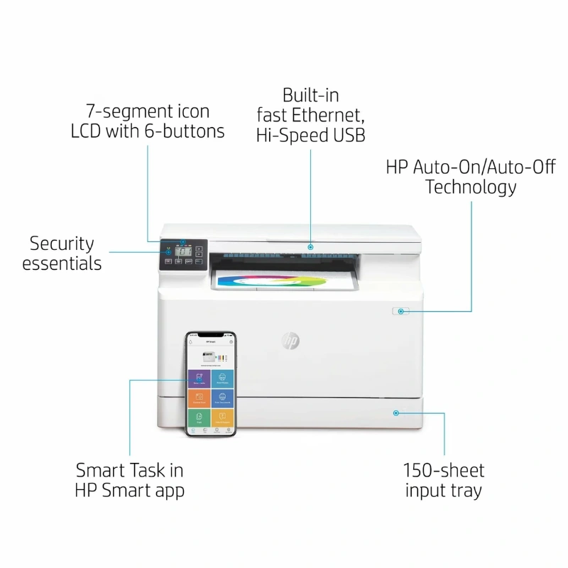 La HP Color LaserJet Pro MFP M182n est une imprimante multifonction laser couleur compacte et performante, conçue pour les petites entreprises et les bureaux à domicile. Elle combine impression couleur de qualité professionnelle, copie et numérisation, tout en offrant une gestion simplifiée grâce à son panneau de commande intuitif et sa connectivité réseau.