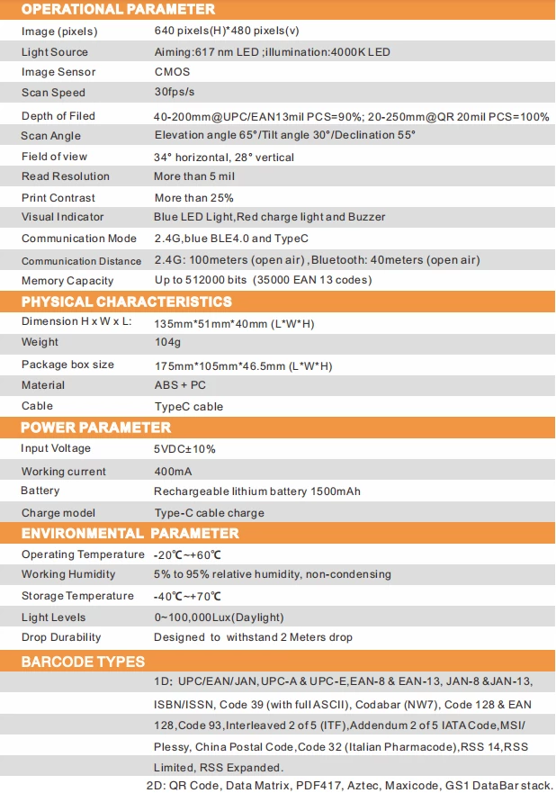 Lecteur Code A Barre Sans Fil (Bluetooth) Henex HC-300R fiche technique