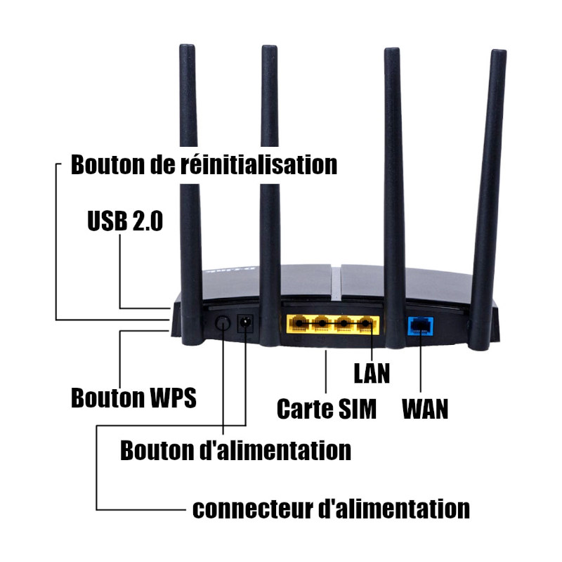 • Antenne: 2 x antenne Wi-Fi 5dBi + 2 x antenne 5dBi LTE15 pour la 4G