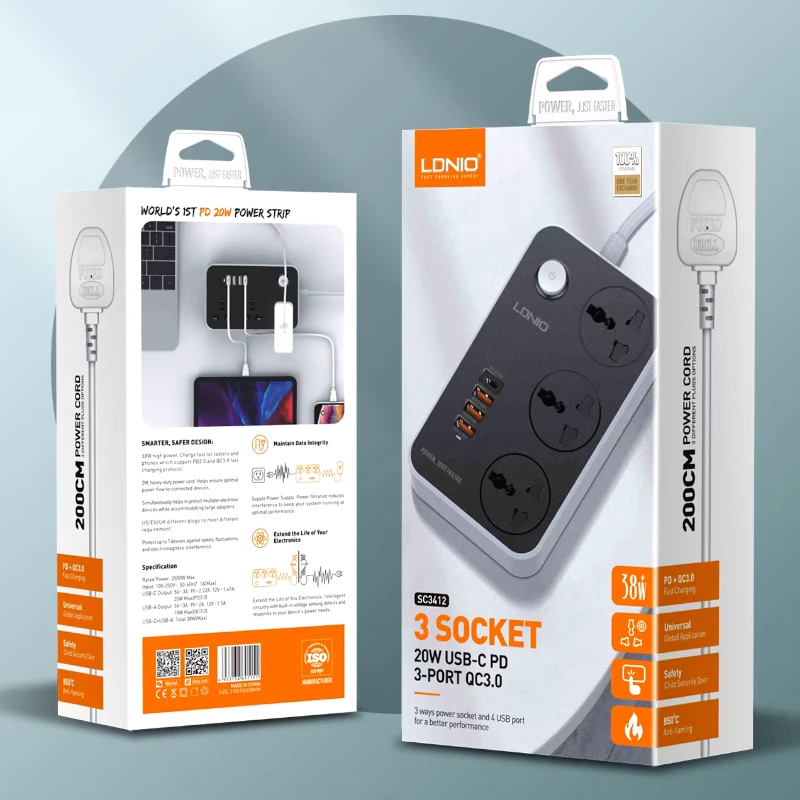 LDNIO SC3412 – prise d’extension électrique intelligente universelle, 3 ports, 4 prises Usb avec prise 2500W, filtre de résea rallonge electrique francais filtres de puissance multi prise multiprise électrique plug